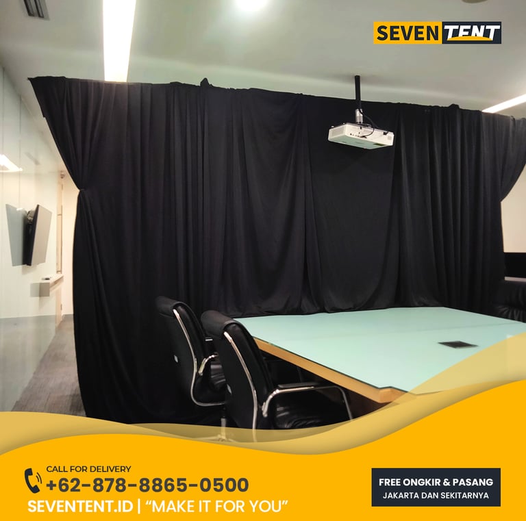 Sewa kain tirai Tangerang Selatan di Seventent.id menyediakan penutup dinding dan penyekat ruangan menggunakan material kain premium seperti Blackout, Velvet, dan Habutai. Memiliki karakteristik kain yang tebal, 100% tidak tembus pandang, dan mampu meredam gema ruangan secara efektif. Kami melayani seluruh wilayah Tangerang Selatan (BSD, Bintaro, Serpong, Pamulang, Ciputat).