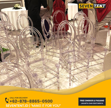 Sewa kursi acrylic Bekasi di Seventent.id menyediakan kursi transparan premium tipe Ghost Chair dan Tiffany Crystal. Terbuat dari material High-Grade Polycarbonate yang memiliki karakteristik kejernihan kristal namun sangat kuat menahan beban hingga 150kg. Kami melayani seluruh wilayah Bekasi hingga Cikarang.