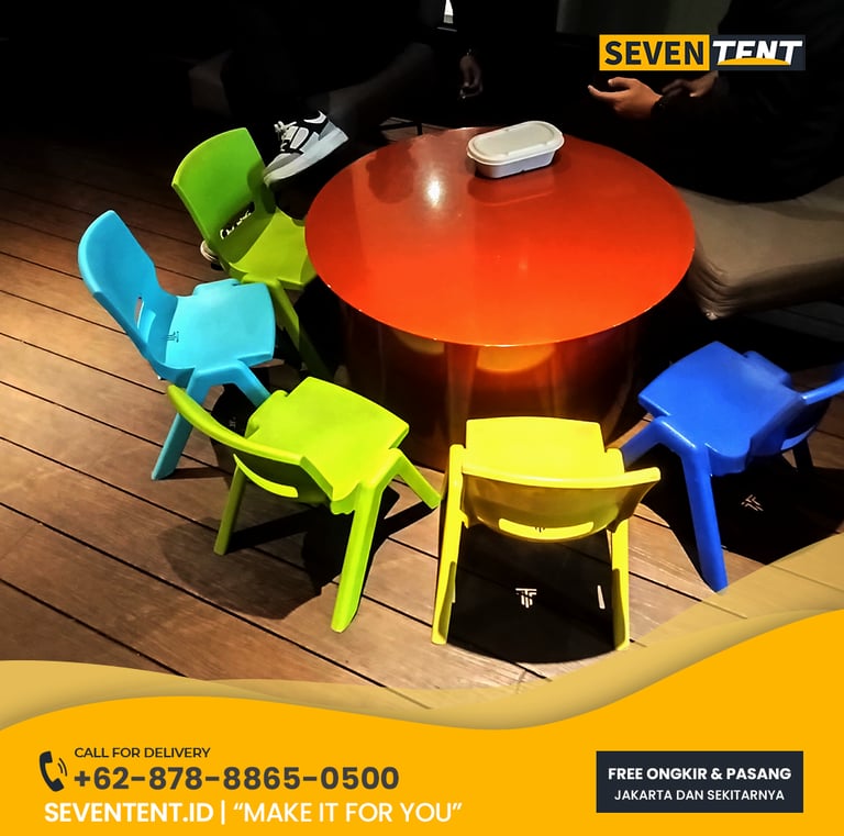 Butuh sewa kursi anak Depok yang warna-warni & aman? Seventent.id menyediakan kursi plastik anak kualitas premium untuk pesta ulang tahun & acara sekolah. Unit bersih, kokoh, & siap antar ke Depok, Kota Depok. Cek harga promo 2026 & buat pesta si kecil lebih ceria di sini!
