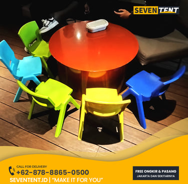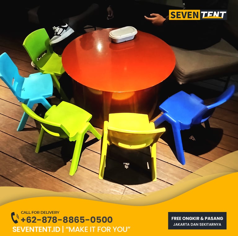 Sewa kursi anak Jabodetabek di Seventent.id menyediakan kursi ukuran mini yang dirancang khusus untuk anak usia 2 hingga 7 tahun. Tersedia dalam berbagai model seperti Kursi Plastik Warna-Warni. Kami melayani seluruh Jakarta, Bogor, Depok, Tangerang, dan Bekasi.