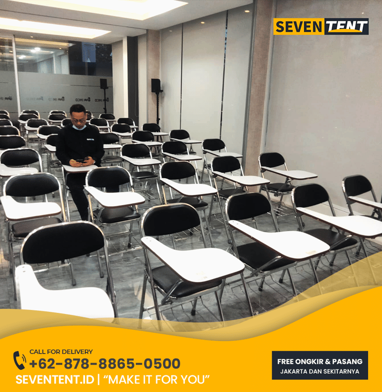 Sewa kursi kuliah Jakarta di Seventent.id menyediakan kursi lipat berkualitas standar industri (tipe Chitose/Futura) yang dilengkapi dengan meja tulis lipat. Terbuat dari rangka besi chrome yang kokoh dan pelapis kulit sintetis (oscar) yang mudah dibersihkan. Kami melayani persewaan untuk kebutuhan ujian, training, dan seminar di seluruh wilayah Jakarta dengan kapasitas stok hingga ribuan unit dan sistem pengiriman tepat waktu.