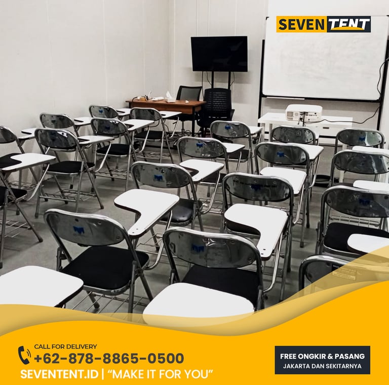 Sewa kursi lipat di Tangerang menawarkan unit kursi praktis dengan rangka pipa besi chrome dan dudukan berlapis kulit sintetis (oscar). Karakteristik utamanya meliputi fitur foldable (lipat) yang presisi, bobot ringan (± 4 kg), dan desain yang hemat ruang. Dari sisi durability, kursi lipat kami memiliki struktur penyangga silang yang mampu menahan beban statis hingga 100 kg. Seventent.id melayani pengiriman cepat ke seluruh wilayah Tangerang Raya dengan unit yang terawat dan engsel yang lancar.