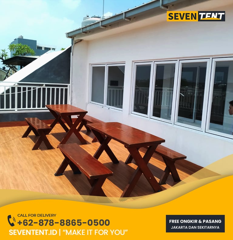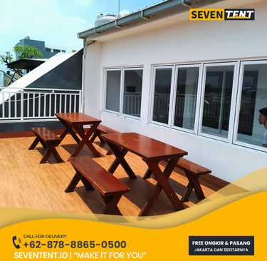 Sewa kursi taman Depok di Seventent.id menyediakan kursi kayu. dengan material kayu solid berkualitas. Memiliki karakteristik warna natural wood (cokelat hangat) yang telah dilapisi finishing tahan air. Sangat ideal untuk kapasitas 2 - 4 orang per unit meja-kursi. Kami melayani wilayah Margonda, Sawangan, Cinere, hingga Tapos.