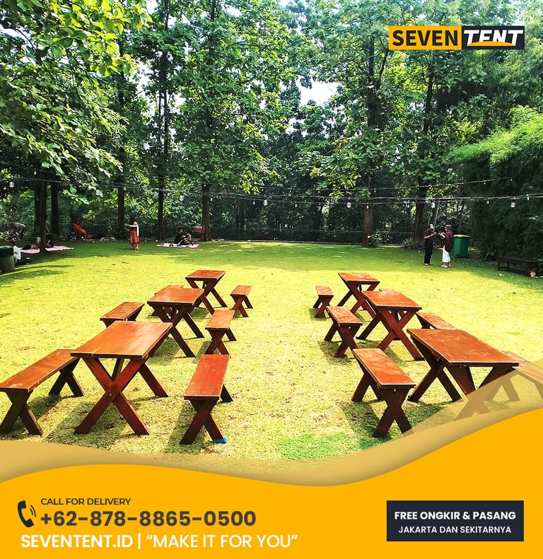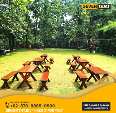Sewa kursi taman Jabodetabek di Seventent.id menyediakan berbagai tipe kursi kayu outdoor. Memiliki karakteristik material kayu solid yang sudah di-finishing tahan air, rangka yang stabil untuk permukaan rumput, dan desain yang estetik. Kami melayani seluruh Jakarta, Bogor, Depok, Tangerang, dan Bekasi.