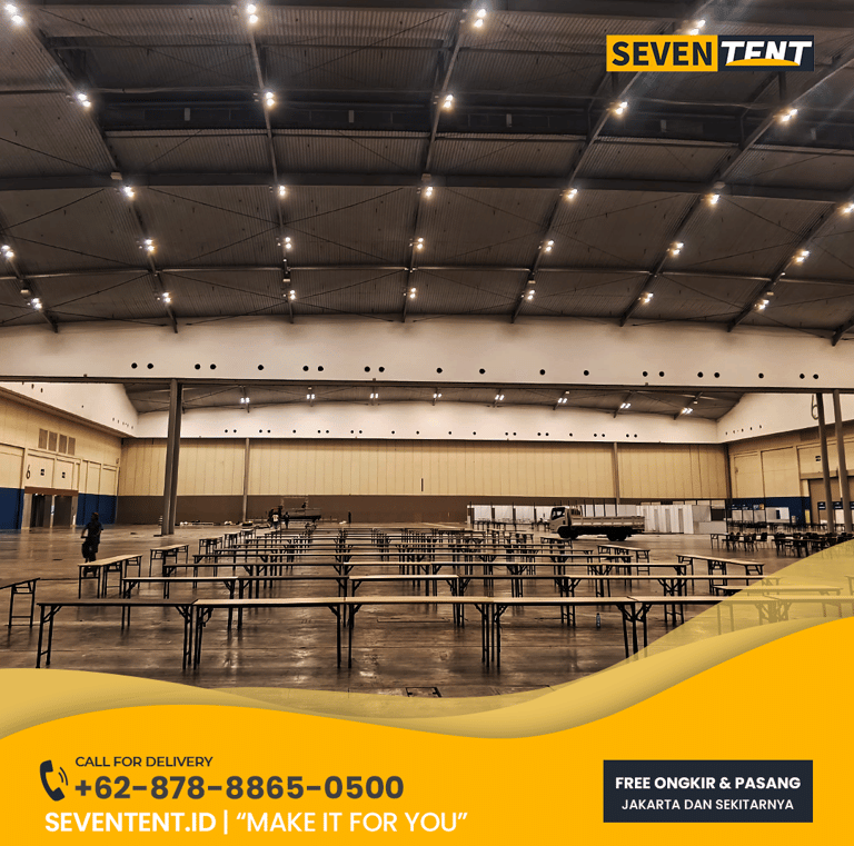 Butuh sewa meja kaki lipat Bekasi yang kokoh & rapi? Seventent.id menyediakan meja kotak & IBM berkualitas untuk bazar, seminar, & event. Unit bersih, rangka stabil, & siap antar ke Cikarang, Tambun, hingga Cibubur. Cek harga promo 2026 & amankan meja acara Anda di sini!