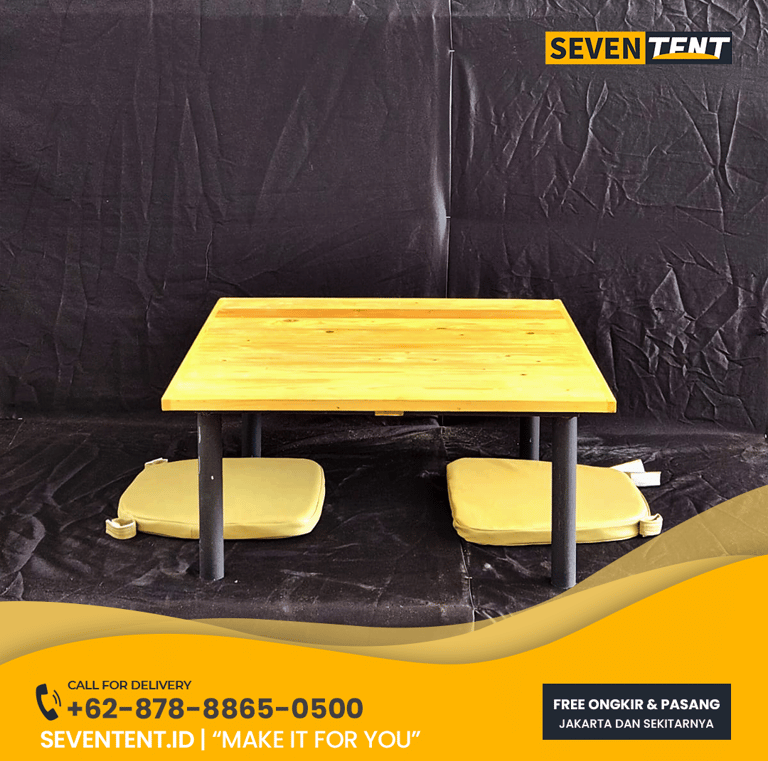 Sewa meja lesehan Depok di Seventent.id menyediakan meja kayu pendek. Meja lesehan kami memiliki karakteristik kaki yang kokoh dan permukaan kayu yang dipoles halus (melamine/HPL). Kami melayani wilayah Margonda, Beji, Sawangan, hingga Cinere.