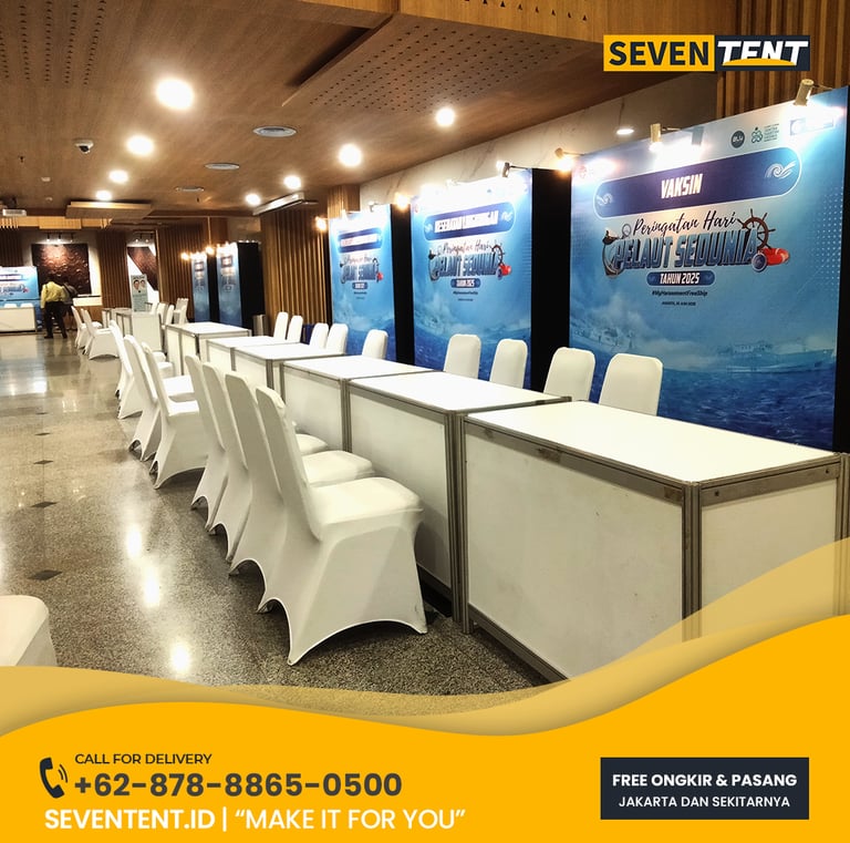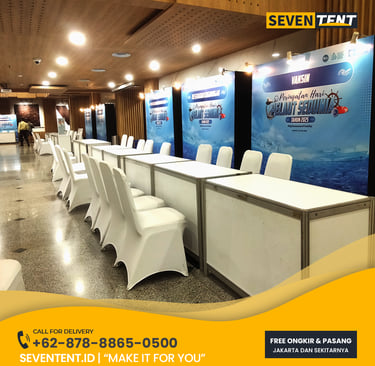 Cari sewa meja partisi Depok yang rapi & kokoh? Seventent.id menyediakan meja registrasi R8 & meja informasi pameran kualitas premium. Material aluminum R8, bersih, & siap antar ke Depok, Kota Depok. Cek harga paket terbaru 2026 & buat area registrasi Anda tampil profesional di sini!