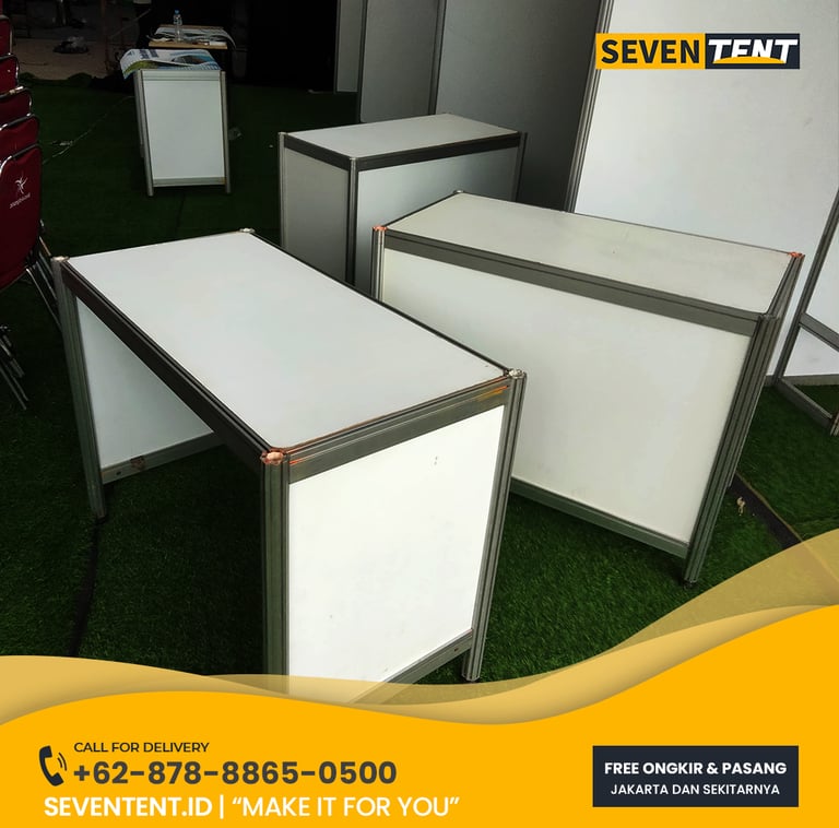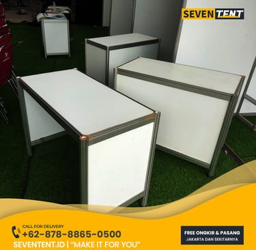 Sewa meja R8 Jakarta di Seventent.id menyediakan meja pameran modular, Terdiri dari rangka aluminium sistem R8 yang kokoh dan panel multiplek berlapis PVC putih berkualitas. Meja ini memiliki karakteristik knock-down (mudah bongkar-pasang) dan mampu menahan beban hingga 30 - 50kg, sangat ideal untuk meja pendaftaran, meja pajangan produk, atau meja kasir di bazar. Kami melayani pengiriman cepat ke seluruh wilayah Jakarta dengan kondisi unit yang terawat dan tanpa cacat visual.