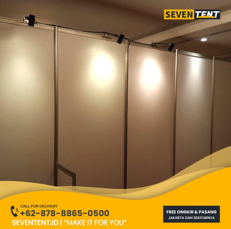 Sewa panel pameran Bekasi di Seventent.id menggunakan sistem modular Aluminum R8 Octagonal dengan panel PVC Board putih kualitas premium. Kami melayani seluruh wilayah Bekasi (Barat, Timur, Tambun, hingga Cikarang).