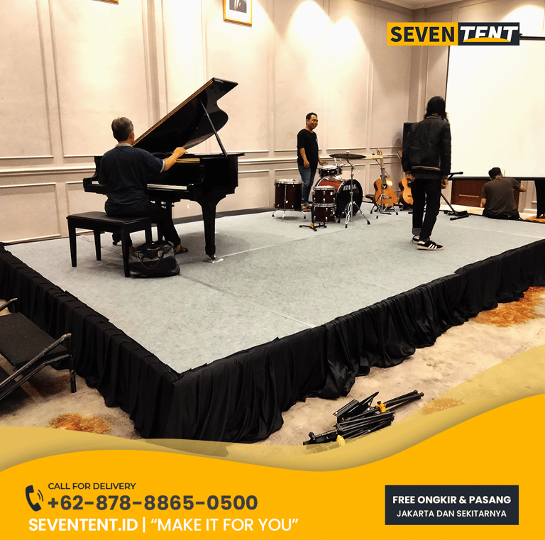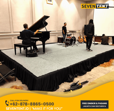 Sewa panggung Depok berkualitas premium di Seventent.id. Tersedia panggung modular, rangka besi kokoh, & finishing karpet rapi. Cocok untuk wedding, konser, & seminar di Depok, Kota Depok. Cek katalog terbaru 2026 & booking sekarang!