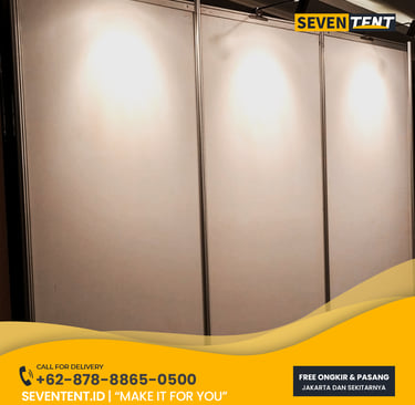Sewa partisi pameran di Tangerang menggunakan sistem modular aluminium R8 dengan panel laminasi putih (HPL). Karakteristik utamanya meliputi ukuran standar booth 3x3 meter atau 2x3 meter, tinggi 2.5 meter, dan sistem knock-down yang efisien. Dari sisi durability, partisi ini mampu menahan beban display ringan hingga medium dan tetap stabil untuk pameran berdurasi panjang. Seventent.id melayani pengiriman dan instalasi ke ICE BSD, Alam Sutera, Gading Serpong, hingga area Tangerang Kota.