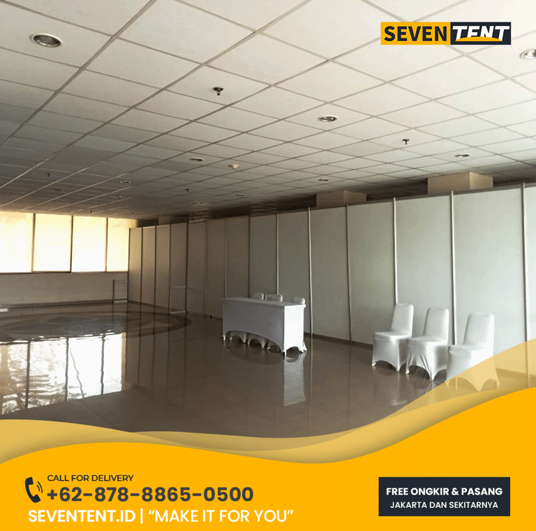 Sewa partisi sekat Depok di Seventent.id menyediakan sistem penyekat ruangan modular menggunakan material Aluminum R8 System dan panel PVC putih bersih. Partisi ini memiliki karakteristik self-standing (berdiri sendiri), kokoh, dan sangat mudah dibersihkan.