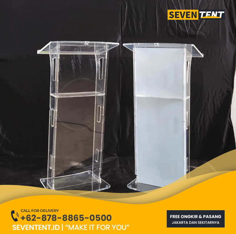 Butuh sewa podium acrylic Bekasi yang mewah & bening? Seventent.id menyediakan mimbar transparan kualitas premium untuk seminar, wedding, & event kantor. Unit anti-baret, stabil, & siap antar ke Cikarang, Tambun, hingga Summarecon. Cek harga promo 2026 & tampilkan kesan modern di acara Anda di sini!