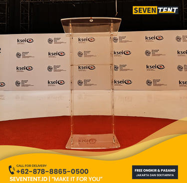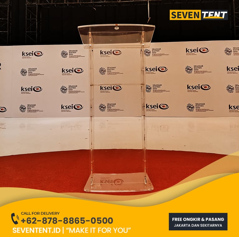 Sewa podium acrylic di Karawang menawarkan unit transparan berkualitas tinggi dengan ketebalan material 10mm hingga 15mm. Karakteristik utamanya meliputi desain minimalis, bobot yang ringan namun stabil, serta dilengkapi dengan mic holder. Dari sisi durability, podium ini tahan terhadap goresan ringan dan memiliki struktur yang tidak mudah pecah. Seventent.id melayani pengiriman ke Karawang Barat, Timur, hingga kawasan industri dengan layanan instalasi cepat.