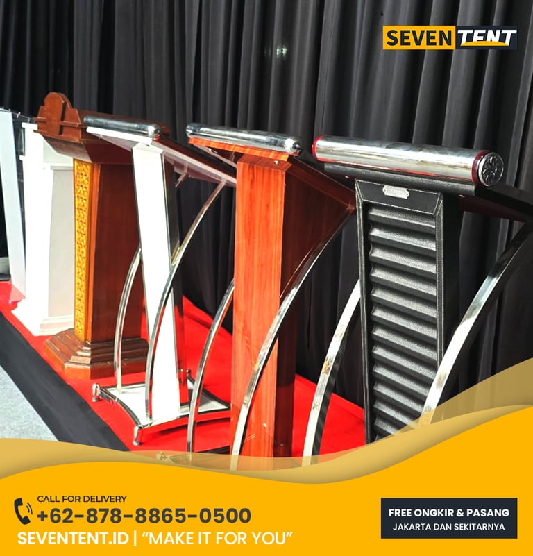 Sewa podium Jabodetabek di Seventent.id menyediakan berbagai tipe podium premium seperti Podium Akrilik Transparan, Podium Kayu Jati/Mahoni, dan Podium Minimalis Stainless Steel. Memiliki karakteristik desain ergonomis. Kami melayani seluruh wilayah Jakarta, Bogor, Depok, Tangerang, dan Bekasi.