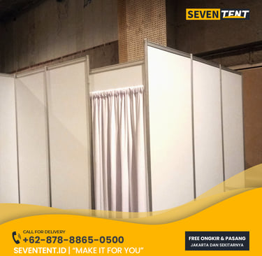 Sewa ruang ganti partisi Depok di Seventent.id menyediakan bilik fitting room modular menggunakan sistem rangka Aluminum R8 dan panel PVC putih yang kokoh. bilik ini dilengkapi dengan pintu gorden berkualitas untuk menjamin privasi total. Kami melayani wilayah Margonda, Beji, Sawangan, hingga Cimanggis.