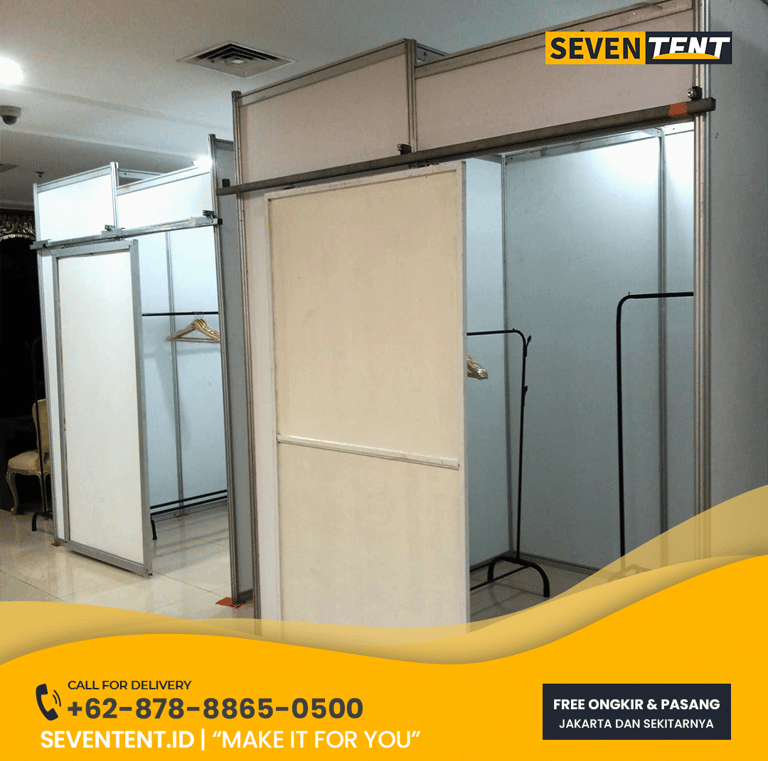 Cari sewa ruang ganti partisi di Jakarta? Seventent.id menyediakan fitting room modular R8 yang privat, kokoh, & bersih. Ukuran kustom, lengkap dengan cermin & lampu. Cocok untuk fashion show, konser, & pameran. Pasang cepat ke seluruh Jakarta, Jakarta Utara, Jakarta Timur, Jakarta Selatan, Jakarta Barat, Jakarta Pusat. Cek harga sewa ruang ganti terbaru 2026 di sini!
