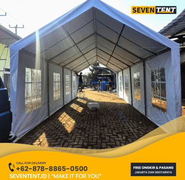 Sewa tenda multiguna 4x6 Jakarta di Seventent.id mampu menampung sekitar 30 - 40 orang dengan susunan kursi theater atau 2 unit mobil jika digunakan sebagai tenda garasi. Tenda ini tersedia dalam pilihan model Plafon Putih Polos atau Dekorasi Serut. Menggunakan rangka besi pipa tebal dan atap terpal waterproof kualitas premium, tenda ini sangat ideal untuk acara syukuran rumah, area tunggu (registrasi), hingga tenda darurat di wilayah Jakarta.