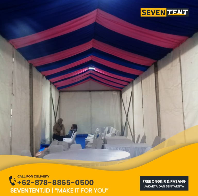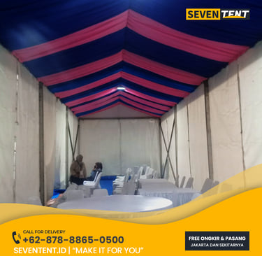 Sewa tenda serut di Tangerang mengacu pada penyewaan tenda konvensional yang didekorasi dengan kain filamin yang dibentuk bergelombang atau serut pada bagian plafon dan tiang. Karakteristik utamanya meliputi kombinasi warna yang fleksibel (2-3 warna), material atap kedap air, dan rangka besi kokoh. Dari sisi durability, tenda ini mampu bertahan di berbagai cuaca dengan estetika kain yang tetap rapi. Seventent.id melayani wilayah Tangerang Selatan, Tangerang Kota, hingga Kabupaten Tangerang.