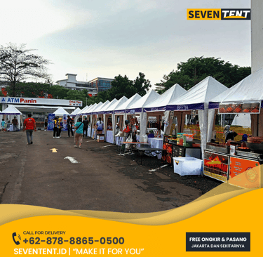 Sewa tenda jualan Depok di Seventent.id menyediakan pilihan tenda bazar berkualitas seperti Tenda Lipat (Folding Tent) dan Tenda Sarnafil (Kerucut). Memiliki karakteristik rangka besi hollow anti-karat dan atap polyester yang 100% tahan air dan panas.