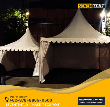Sewa tenda murah Jakarta di Seventent.id menawarkan solusi paket hemat untuk berbagai kebutuhan acara. Tersedia jenis Tenda Plafon untuk acara rumah, Tenda Sarnafil (Kerucut) untuk pameran, hingga Tenda Roder untuk skala besar. Semua layanan kami sudah mencakup biaya pasang-bongkar, transportasi untuk area Jakarta, dan jaminan kain bersih serta rangka besi yang stabil.