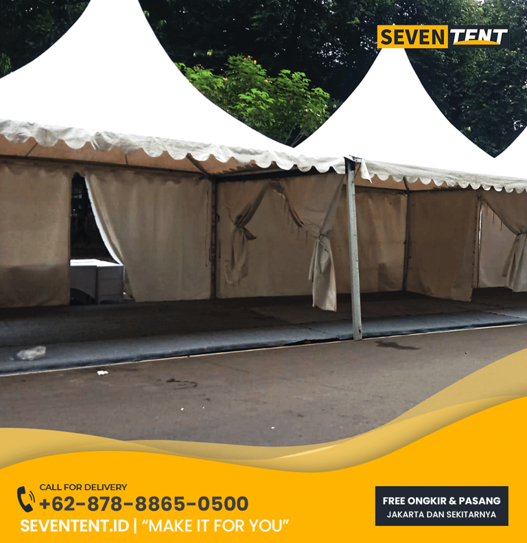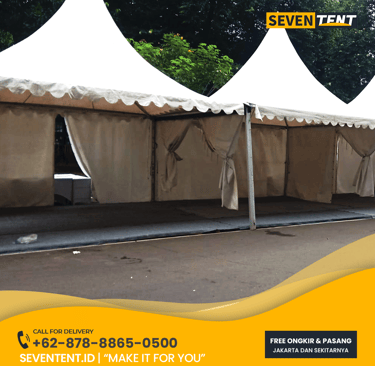 Cari sewa tenda sarnafil 5x5 Tangerang Selatan yang mewah & luas? Seventent.id menyediakan rental tenda kerucut putih kapasitas besar untuk event di BSD, Bintaro & Serpong. Unit bersih, rangka aluminium kokoh, & siap antar tepat waktu. Cek promo harga 2026 & buat area VIP Anda makin berkelas di sini!