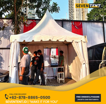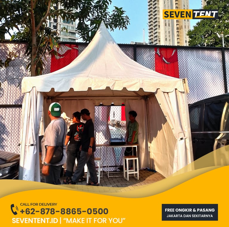 Cari sewa tenda sarnafil di Jakarta? Seventent.id menyediakan sewa tenda kerucut pagoda ukuran 3x3 & 5x5 berkualitas premium. Rangka aluminium kokoh, kain PVC bersih, & waterproof. Pasang cepat ke seluruh wilayah Jakarta, Jakarta Utara, Jakarta Timur, Jakarta Selatan, Jakarta Barat, Jakarta Pusat. Cek harga sewa tenda sarnafil terbaru 2026 dan spek lengkapnya di sini!