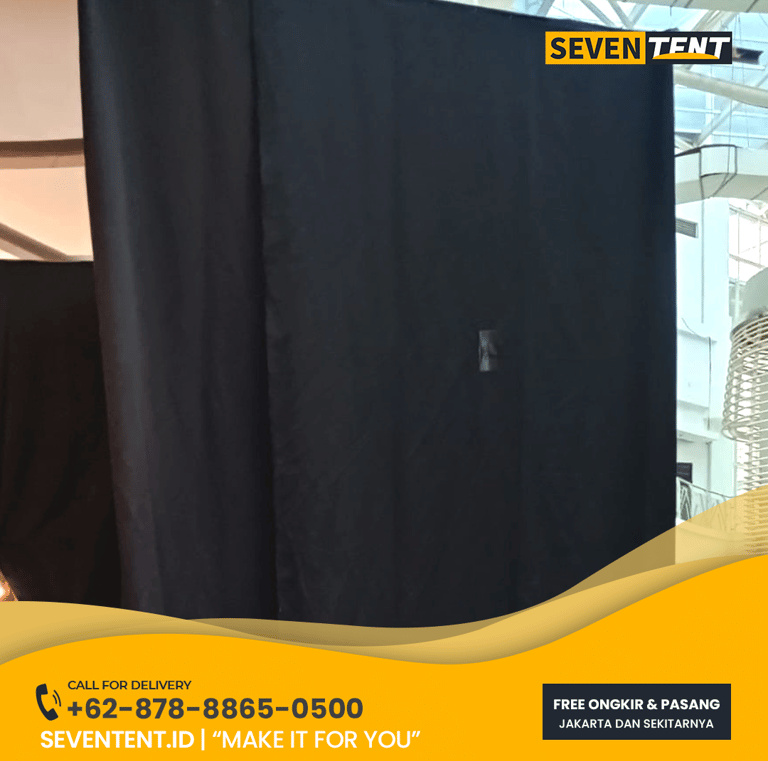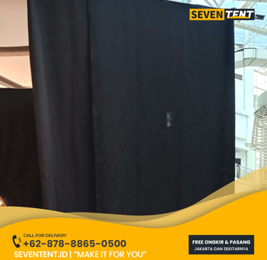 Sewa tirai Bekasi di Seventent.id menggunakan sistem Pipe and Drape modular dengan tiang penyangga self-standing yang kokoh. Tersedia pilihan material kain Blackout (kedap cahaya), Velvet (beludru mewah), hingga kain dekorasi serut. Kami melayani seluruh wilayah Bekasi (Barat, Timur, Tambun, hingga Cikarang).