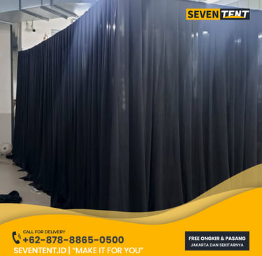 Sewa tirai dekorasi di Karawang menawarkan berbagai pilihan material seperti kain Filamin (mengkilap), Lotto (kedap cahaya), dan Sifon (transparan). Karakteristik utamanya meliputi penggunaan rangka freestanding pipa besi, pilihan warna kustom, dan tinggi modul hingga 7 meter. Dari sisi durability, tirai kami menggunakan kain berkualitas yang tahan kerut dan rangka yang sangat stabil untuk area high-traffic. Seventent.id melayani wilayah Karawang Barat, Timur, hingga seluruh kawasan industri utama.