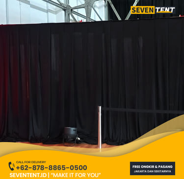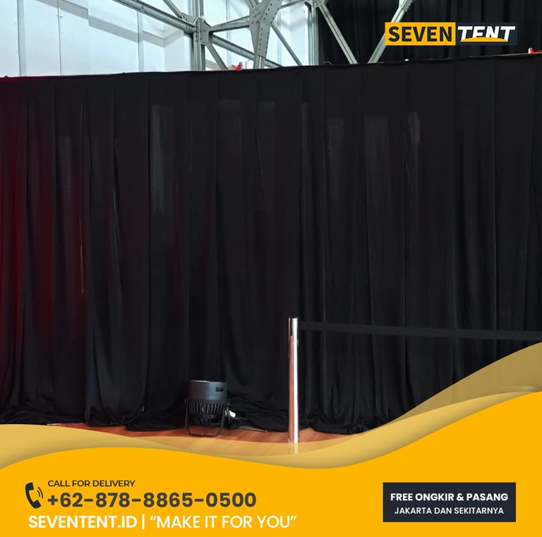 Sewa tirai Depok di Seventent.id menyediakan berbagai jenis kain dekorasi seperti Kain Lototto (Blackout), Kain Habutai, hingga Kain Velvet dengan sistem pemasangan menggunakan rigging atau tiang stand yang kokoh. Kami melayani wilayah Margonda, Beji, Sawangan, hingga Cinere.