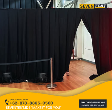 Butuh sewa tirai hitam Depok yang rapi & blackout total? Seventent.id menyediakan kain tirai hitam premium untuk panggung, studio, & penyekat ruangan. Unit bersih, tanpa pantulan cahaya, & siap pasang di Depok, Kota Depok. Cek harga terbaru 2026 & transformasi venue Anda di sini!