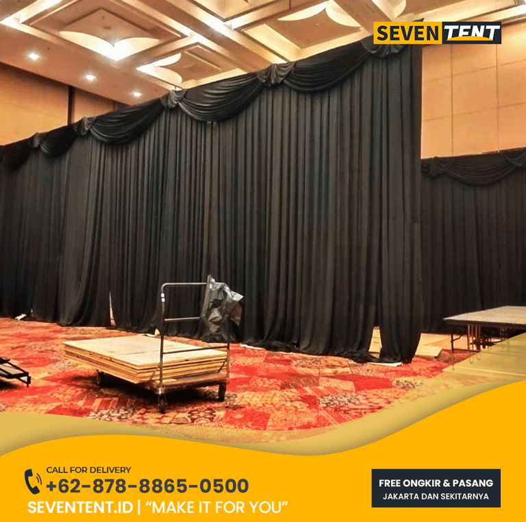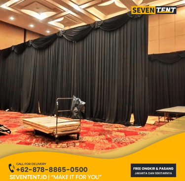 Sewa tirai Jakarta di Seventent.id menyediakan berbagai jenis tirai untuk kebutuhan acara, mulai dari Tirai Peresmian (Unveiling Curtains) otomatis, Tirai Panggung (Stage Backdrops), hingga Tirai Pembatas Ruangan (Blackout). Kami menggunakan material premium seperti Velvet (Beludru) tebal dan Satin Heavy-Weight dengan pilihan sistem penarikan manual atau mesin otomatis (remote control). Layanan kami mencakup pengiriman, pemasangan rangka standing frame, dan bongkar-pasang ke seluruh wilayah Jakarta (Selatan, Pusat, Barat, Timur, Utara) dengan jaminan kain bersih dan rapi.