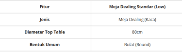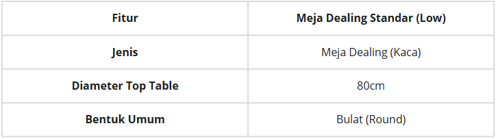 Ukuran meja dealing standar umumnya memiliki diameter 80 cm, Meja ini dirancang kompak agar muat di area booth terbatas namun tetap nyaman untuk negosiasi antara 2 hingga 4 orang.