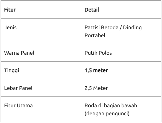 "Partisi beroda adalah pembatas ruangan portabel dengan tinggi 250 cm. dengan rangka aluminium atau besi ringan dan roda heavy-duty dengan sistem pengunci (lockable wheels), partisi ini dirancang untuk kemudahan mobilitas. Tinggi 2,5 meter adalah ukuran ideal yang memberikan privasi visual tanpa membuat ruangan terasa sempit atau pengap."