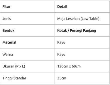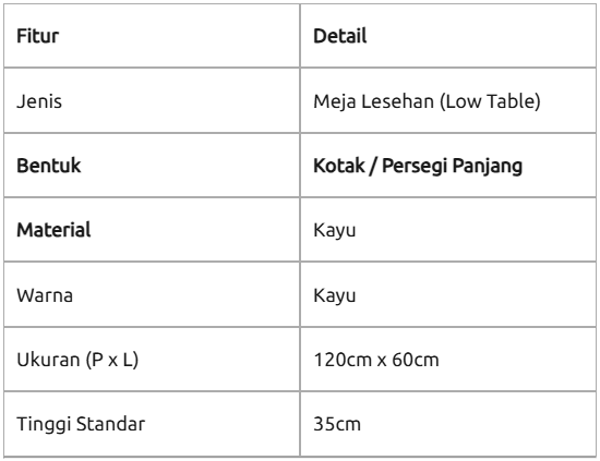 Safety Edging: Semua pinggiran meja diproses dengan sistem edging yang tumpul dan halus. Hal ini sangat penting untuk mencegah tangan atau kaki Anda tergores saat bergeser di area lesehan yang sempit.