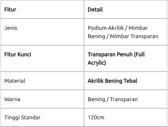 Podium akrilik memberikan kesan modern, bersih, dan futuristik. Keunggulan utamanya bagi dokumentasi acara adalah sifatnya yang transparan, sehingga pakaian dan bahasa tubuh pembicara tidak tertutup oleh badan podium. Selain itu, panggung akan terasa lebih luas karena podium akrilik tidak memblokir pandangan visual secara masif.